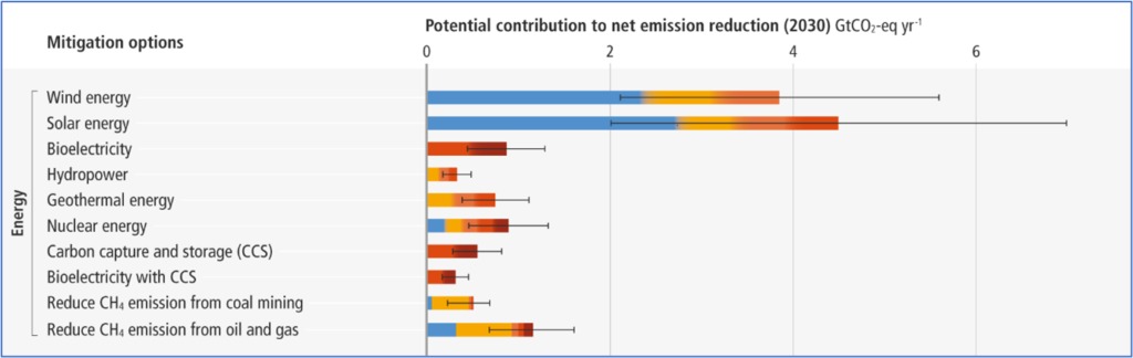 One of its summary charts makes it clear that wind and solar energy can reduce carbon emissions much more than any other source. Nuclear power and carbon capture and storage each have just 10% of the potential of wind and solar, and at far higher cost (orange and red).